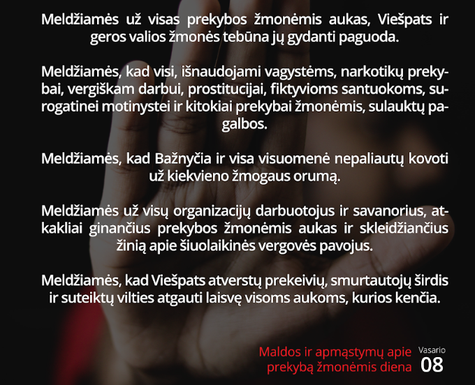 Artėjant Pasaulinei maldos už prekybos žmonėmis aukas dienai, vasario 6-ąją Lietuvos Caritas sukvietė visus, neabejingus šiai problemai į nuotolinį renginį „Maskuojama, bet klesti“ prekybos žmonėmis realybė“.